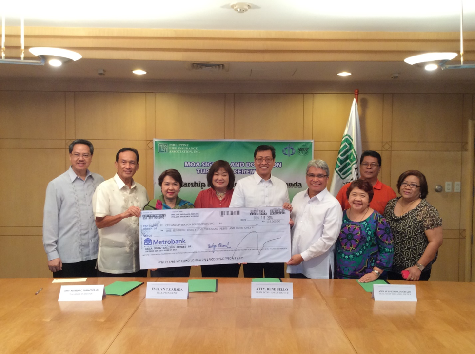 The Philippine Life Insurance Association, Inc. (PLIA) entered into a Memorandum of Agreement on 8 August 2014 with the Couples for Christ BCOP-ANCOP (Building the Church of the Poor-Answering the Cry of the Poor) for the donation of a scholarship fund to finance ten High School students from the Typhoon Yolanda affected communities in Leyte for the school year 2015-2016.